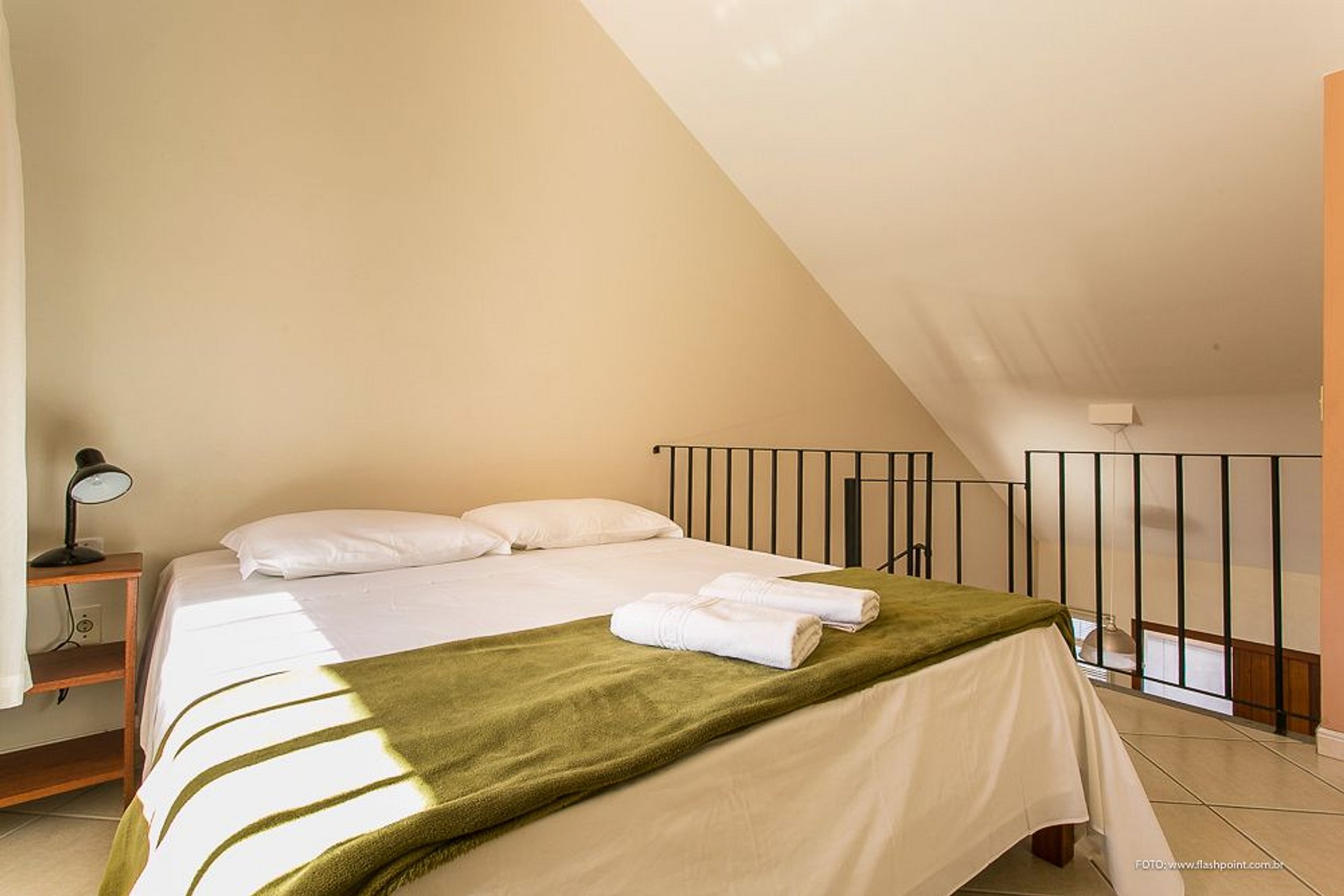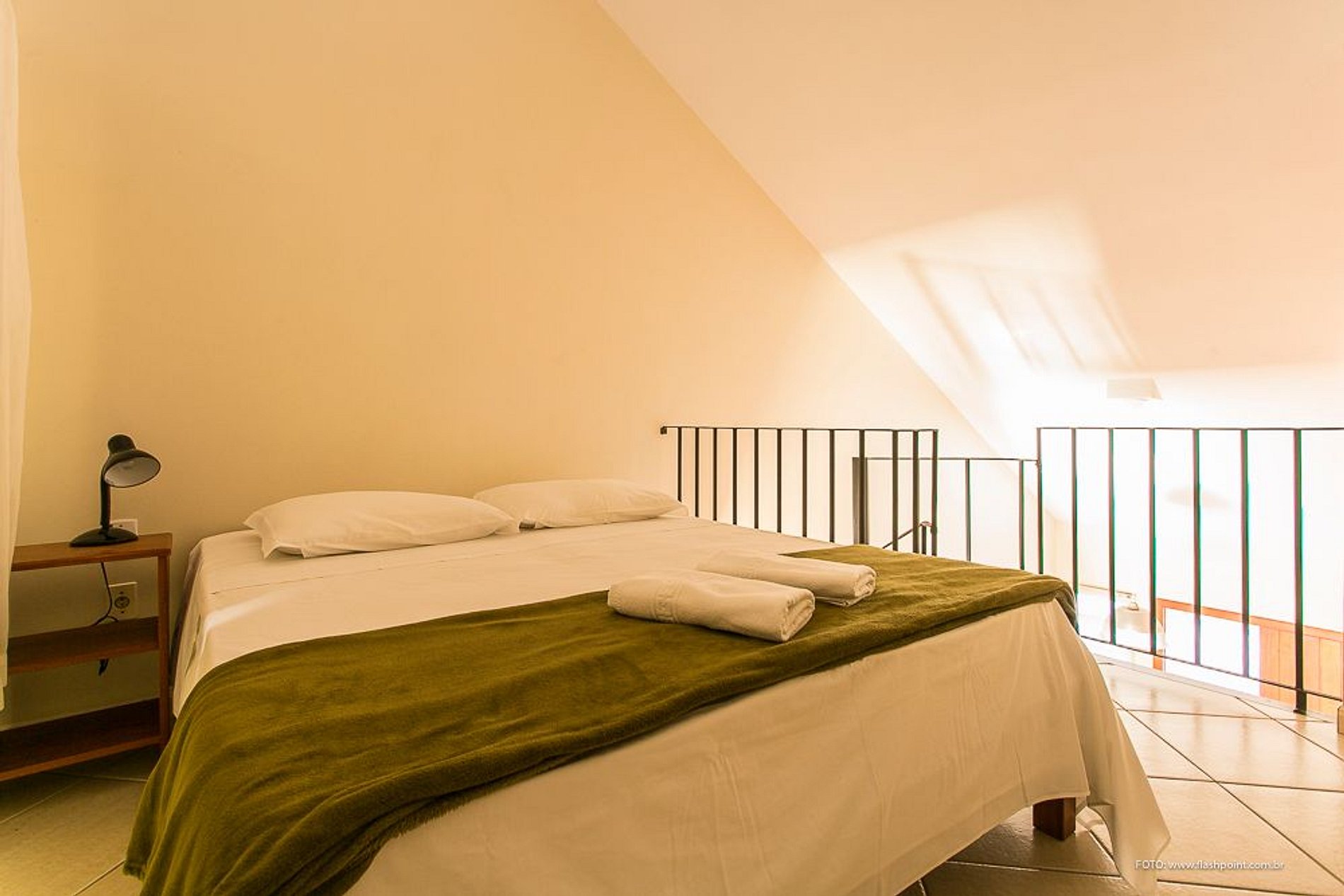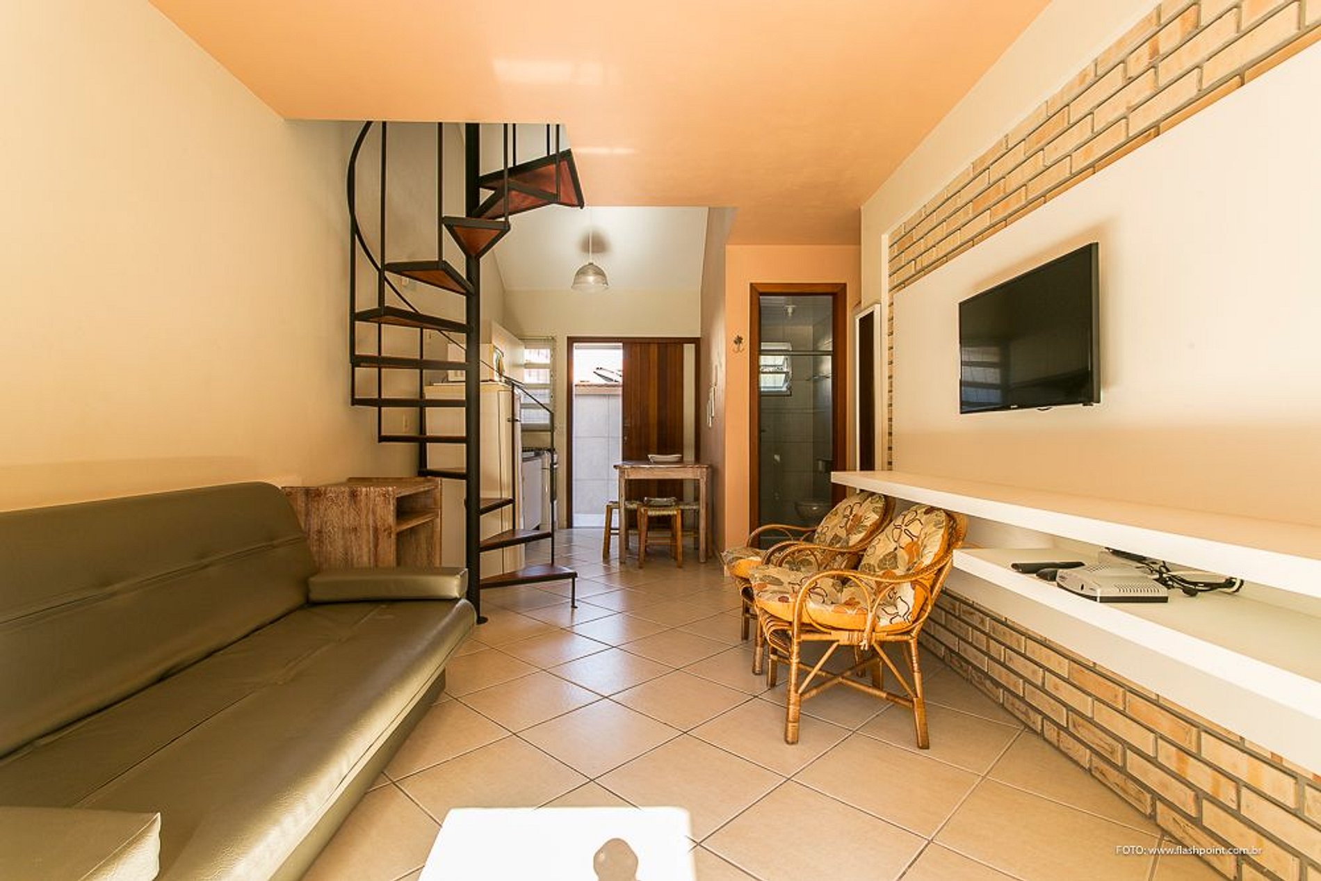 O imóvel conta, no térreo, com sala de estar com sofá cama e cozinha conjugada, churrasqueira e área de serviço. No mezanino, preparamos cama de casal, ou 2 de solteiros e o banheiro.
