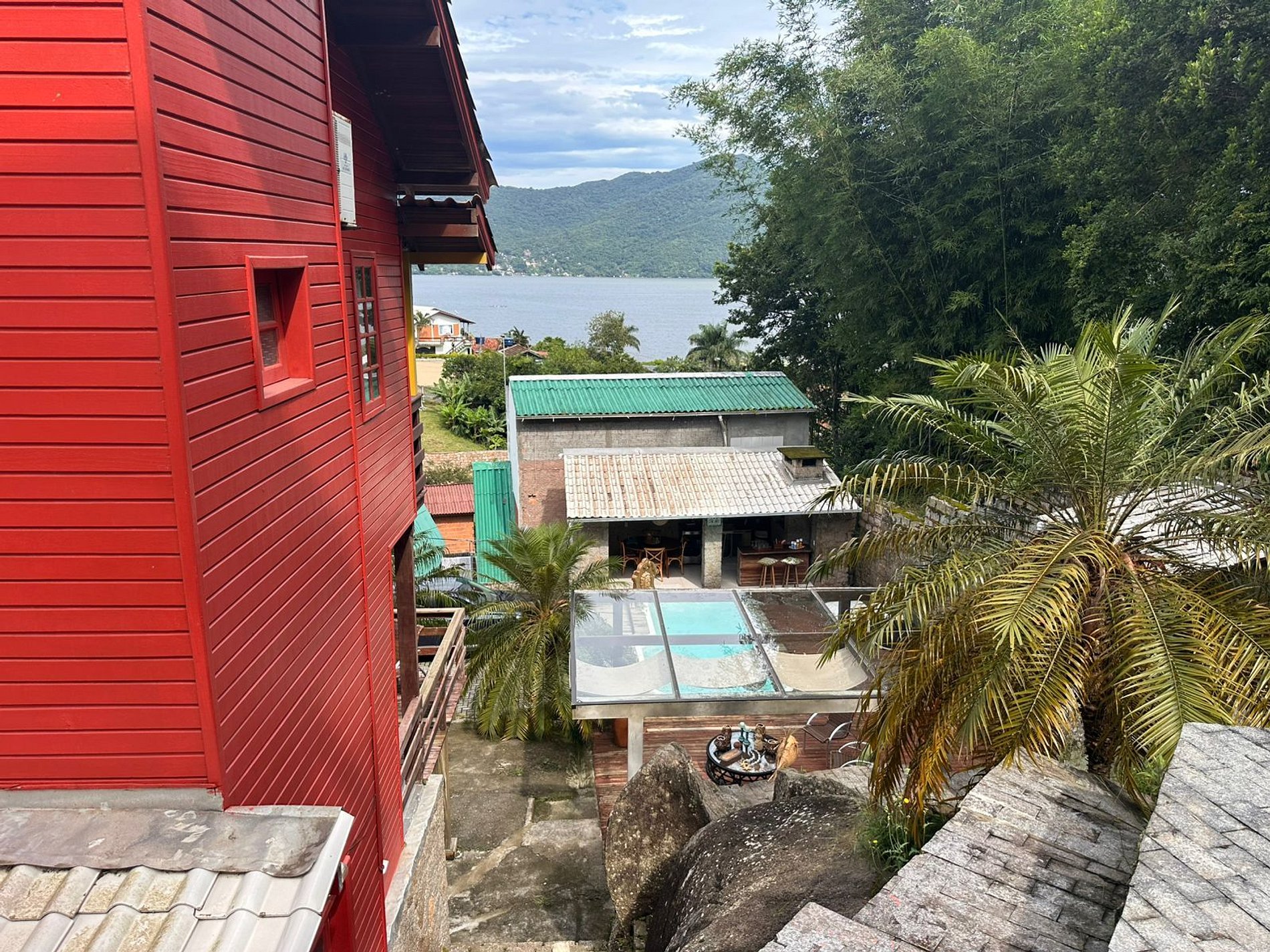 Linda casa pre-fabricada em terreno de 500 m² com piscina e vista para a Lagoa da Conceição. 2 quartos com ar condicionado, 3 banheiros, espaço comúm com área gourmet com churrasqueira, a 800 metros da praia Mole e 2km da praia da Barra da Lagoa